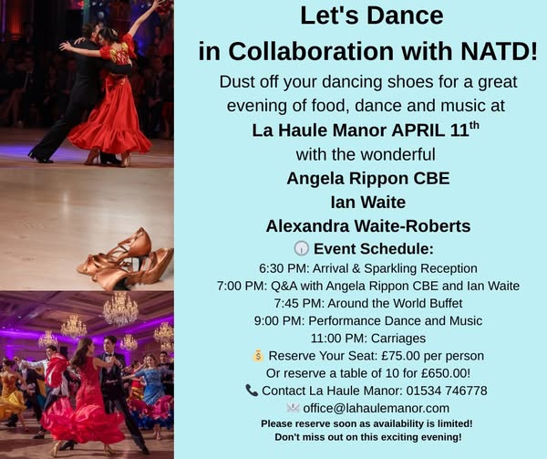Dust off your dancing shoes for a great evening of dance, music and food at La Haule Manor on Saturday 11th April, with the wonderful Angela Rippon, Ian Waite and Alexandra Waite-Roberts!
